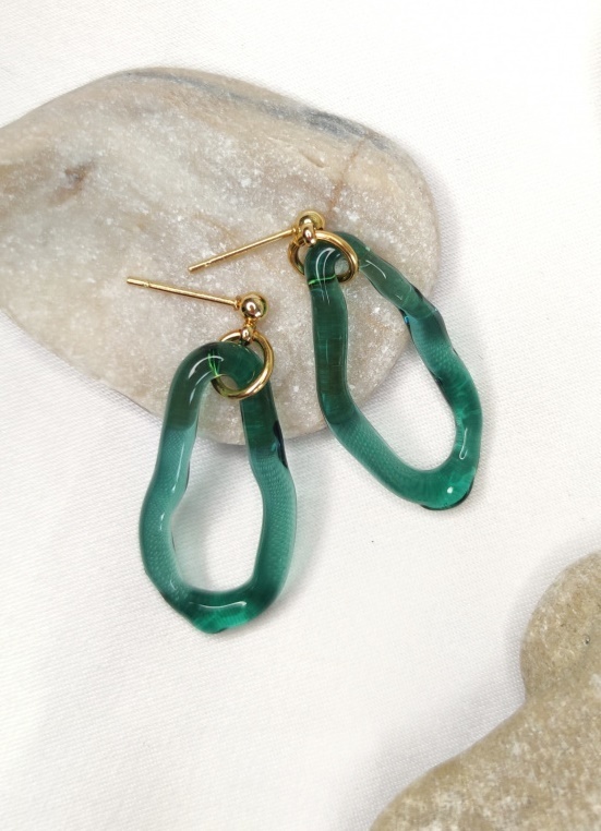 Para kolczyków wykonana jest w szkle o pięknym kolorze szmaragdowej zieleni. Ten model stworzony jest dla kobiet poszukujących niebanalnych rozwiązań w biżuterii. Kolczyki będą pięknym, energetycznym dodatkiem do Twojej codziennej lub wieczorowej stylizacji.
